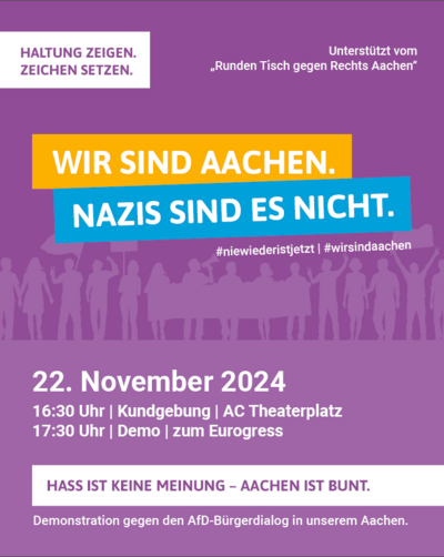 Wir teilen den Aufruf des Bündnis "Wir sind Aachen", am 22.11.24 für ein solidarisches Aachen auf die Straße zu gehen.